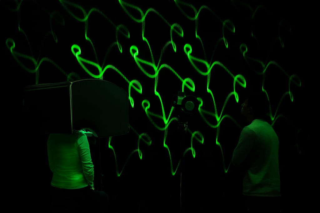 For this work, Triana again used a custom laser system to make the properties of vibrational phenomena visible. In this case, the modulated hum generated by the BCI was accompanied by an array of green laser waveforms that twisted and contorted across a long, white wall. The interacting visitor, whose reactions to the score informed the behavior of the visible waveforms in synch with their audible counterpart, was both instruments for and performer of the work. However, preoccupied by the act of listening, this visitor was unaware of the spectacle produced, an arrangement that lent an uncalculated quality to the scene. Basic neurological and physiological expression made “an essential reality […] manifest through the human body as mood, action, meaning, agenda, and ideology.”7 All factors contributing to the constitution of personhood were provoked by the audible score and relayed to the audience.